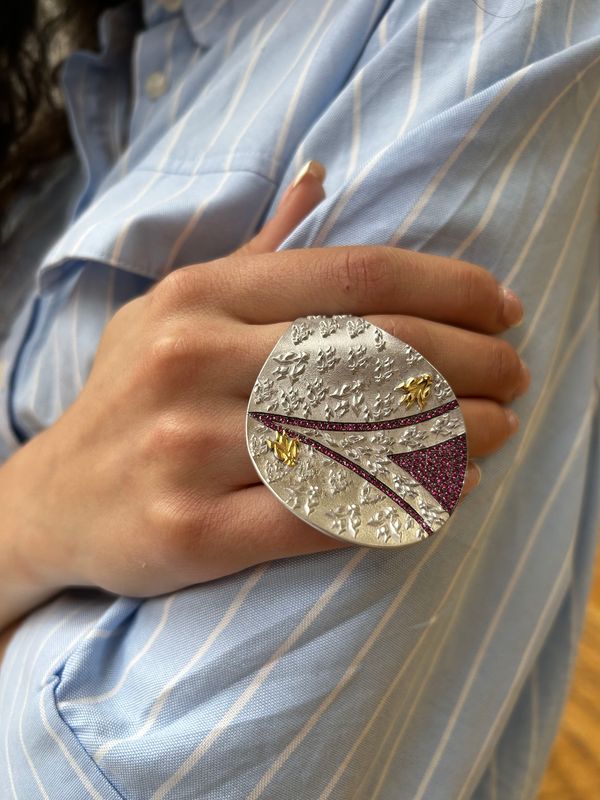 Each piece in SECRET GARDEN , a ring, a necklace, an earring . is born from that memory. They are private glades; small forests you can carry wherever you go. I don’t polish them until they lose their soul , I let the subtle ridges of a leaf, the soft veins of a petal, the gentle irregularities remain. Like nature’s fingerprints.