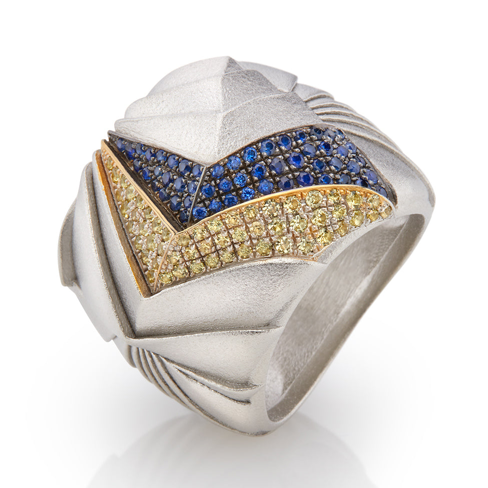 This sculptural ring from the Highways collection captures the rhythm and precision of engineered beauty. Crafted in sterling silver and adorned with meticulously set yellow and blue sapphires, the design evokes the dynamic energy of intersecting highways and the elegance of purposeful direction. Its bold chevron motif is reminiscent of directional markings and architectural blueprints—symbols of movement, decision, and momentum.